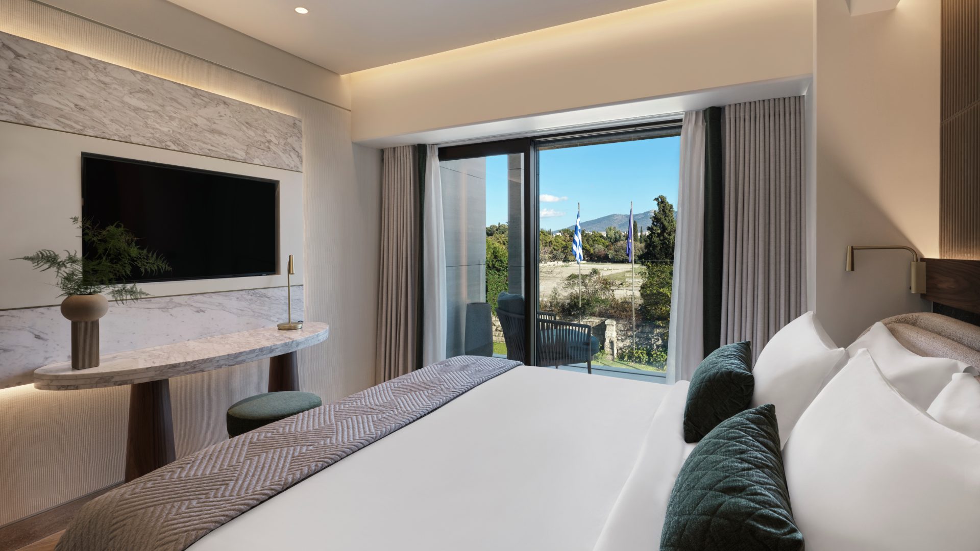A ROOM OF QUIET ELEGANCE, OFFERING BALCONY VIEWS THAT EMBRACE THE TEMPLE OF OLYMPIAN ZEUS. THIS SPACE BALANCES POISE AND COMFORT WITH SUBTLE CHARM.