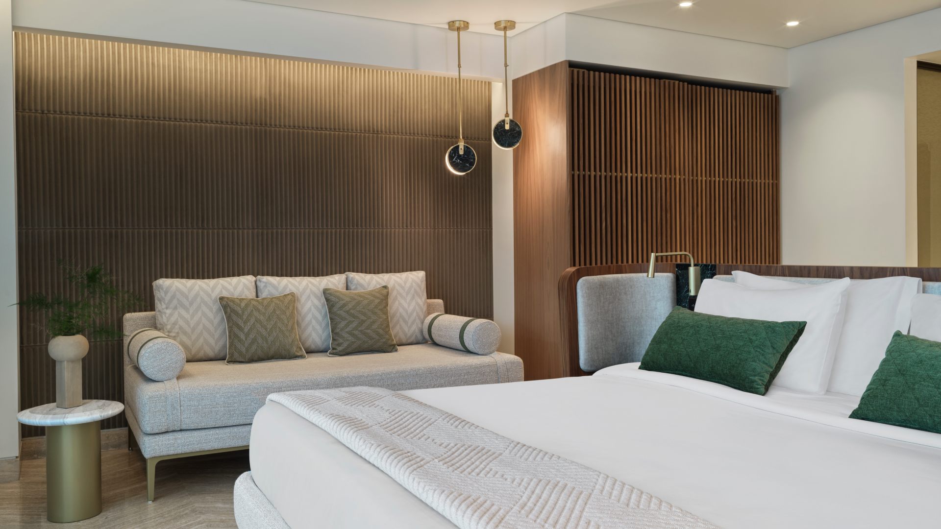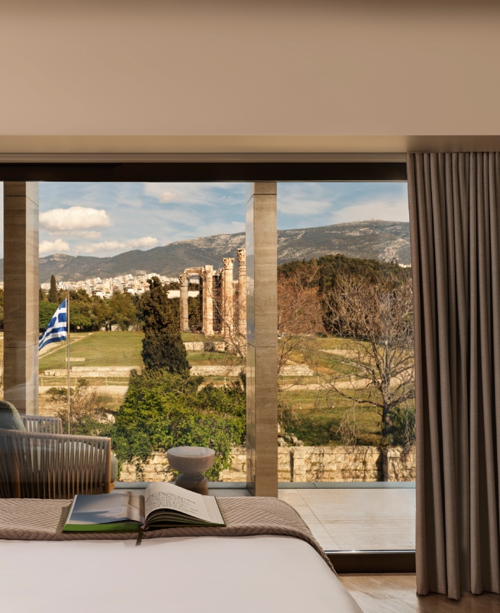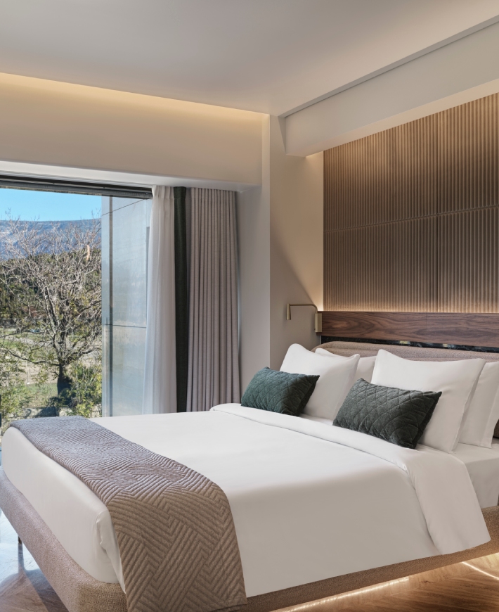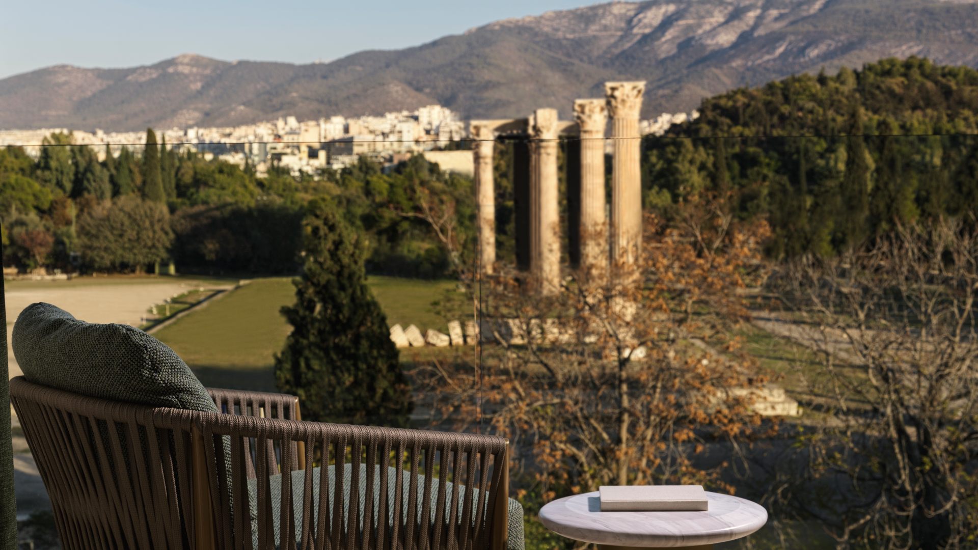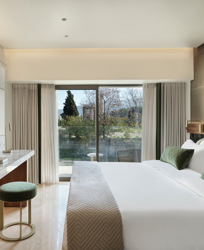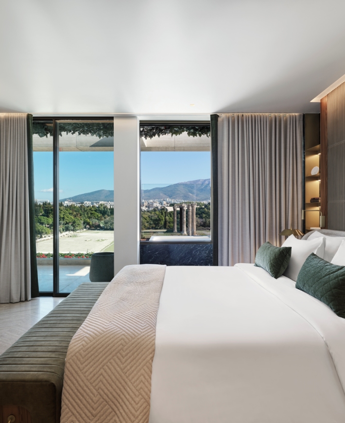 A REFINED SUITE THAT COMBINES GENEROUS SPACE WITH SUBTLE ELEGANCE. THE BALCONY CAPTURES A SWEEPING VIEW OF ATHENS’ HISTORIC LANDMARKS.