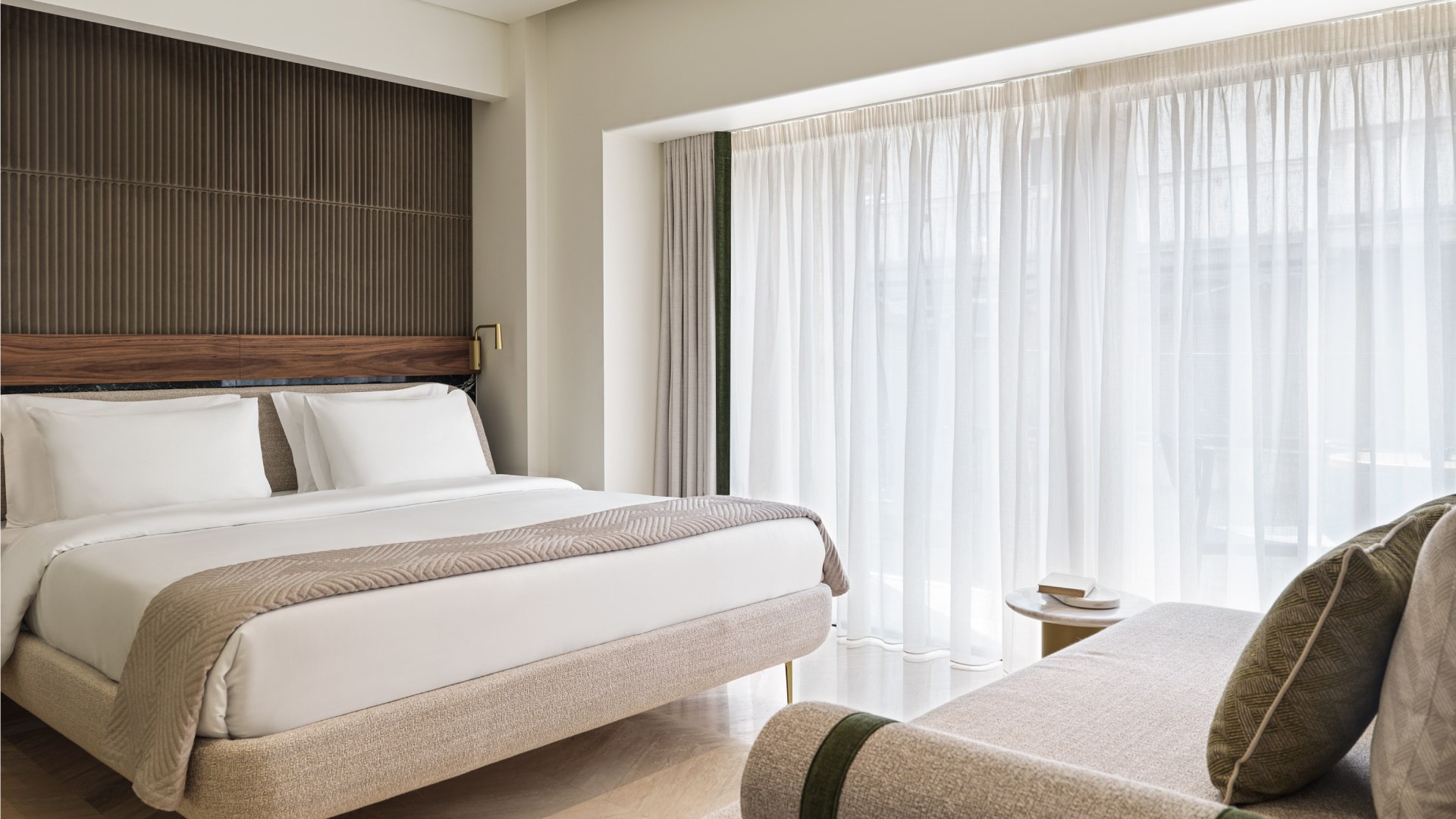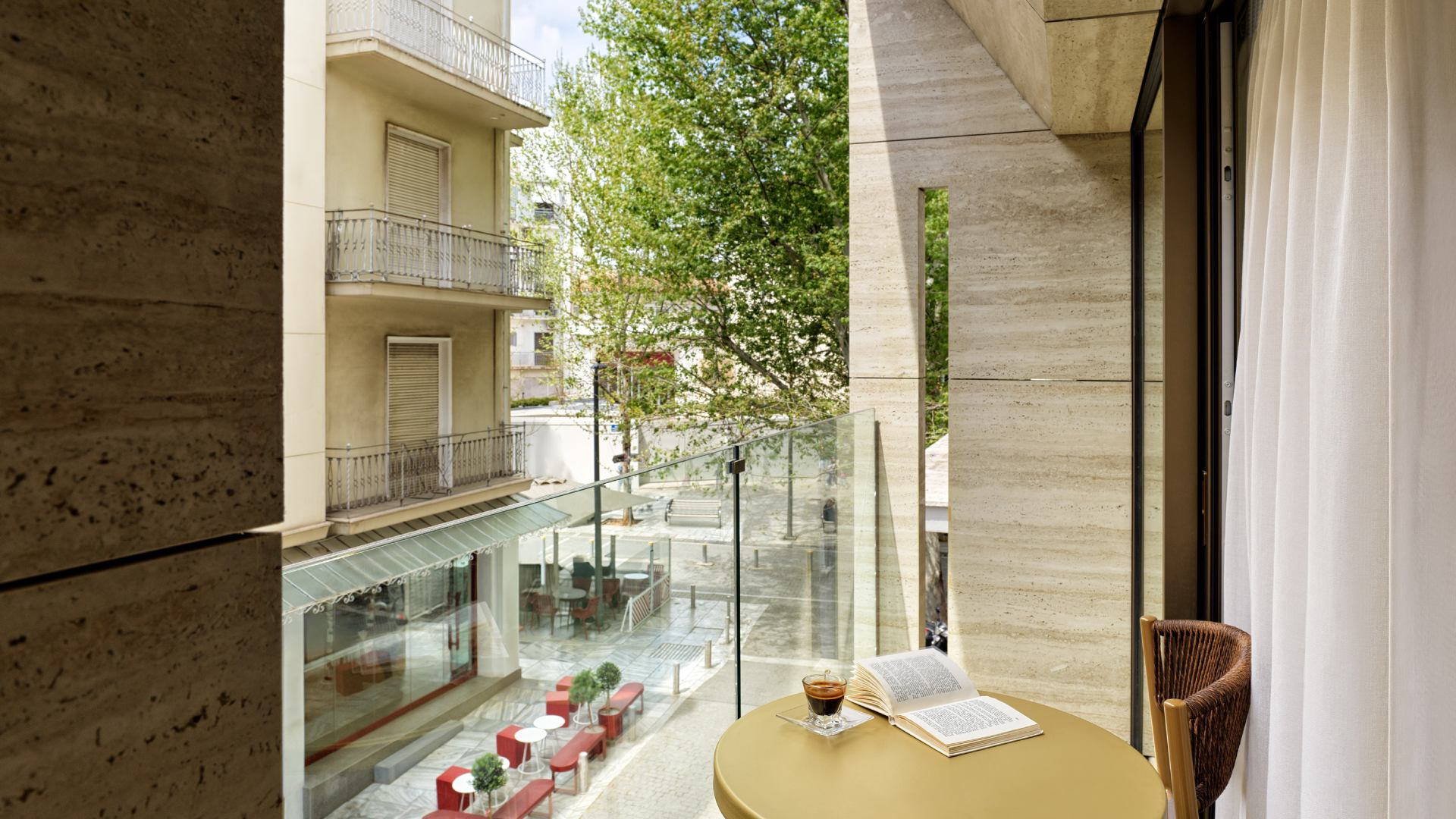 ENVELOPED IN SOFT TONES AND UNDERSTATED ELEGANCE, THIS ROOM OFFERS A PEACEFUL RETREAT WITH A PRIVATE BALCONY FACING DIONYSIOU AREOPAGITOU STREET. IT INVITES YOU TO BREATHE IN THE VIBRANT ENERGY OF ATHENS WITH CALM GRACE.
